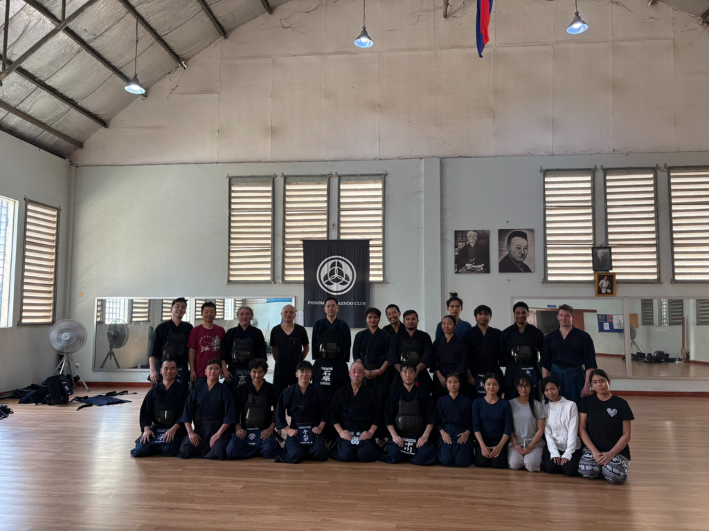 後記 稽古前日にはわずか30数年前迄続いていたカンボジア内戦の博物館を訪れました。それはもうここには書けないほどの暗い過去が紹介されてました。でも彼らとの稽古に触れ,これからのカンボジアの隆盛に剣道の精神が必ずや「彼らの彼女らの」心の支えになるだろう,そうなってほしい,そんな思いで稽古をしました。そして稽古が終わりとても爽やかな清々しい気持ちになりました。カンボジアの熱い風の中,色々な思いを胸に赤い大地をバイクタクシーで空港まで揺られました。あぁ,またカンボジアへ行きたい❣もうすぐにでもカンボジアへ行きたい❣「稽古やめてアンコールワット行くか?」そんな自分のさぼり心がとても恥ずかしくなりました。写真:前列中心に中川先生、後列左から3人目が小手抜き面の達人,吉田先生です。さぁ!稽古しよう!