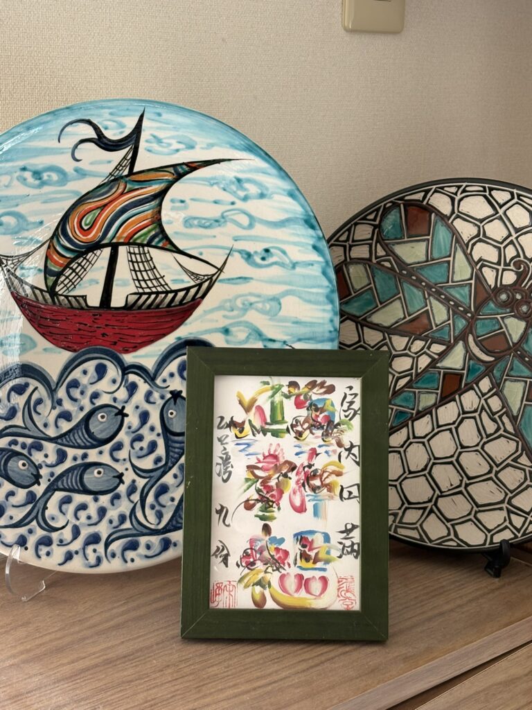 後記 写真は私の剣道旅のお土産です。四角い額は台湾の九分(きゅうふん)です。台湾のおばあちゃんが「あなたの名前を絵に描きます」というのです。(意味が解らんけども)私は自分と同行した子供の名前を伝えたところ,おばあちゃんはさらさらとわずか数分で鼻歌交じりにこれを仕上げてくださいました(私の名前は「順」,一番上です。それ以外の下の2つの名前わかるかな?)。お土産を買う際には自分との約束があります。それは「値段を聞かずに,気に入ったものを買う」です。自分の想定より値段が高くても「金額を聞くまでのドキドキ感や驚き感」も含めて自分へのお土産と考えてます。とは言えもちろん限度があります。ですので,はじめに「これをください」と云います。しかし「値段を聞いてあまりに高い」場合は「くれゆーたやん!買うゆーてへんやん!」とキレる事にしています(値切り交渉は嫌いなのでしません)。しかし幸か不幸か今までそんな事態になった事はありません。カラフルな絵皿はトルコ土産,トンボの柄が今回のベトナム土産です。あれ?カンボジア土産がない!そうなんです。あれほど感動した稽古やったのに,カンボジアの熱い風にやられてしまって,買ったものは日々愛飲しているサッポロビールだけ。カンボジア料理はめっちゃ美味しかったし,なんといっても人々が礼儀正しくて純粋です。やっぱり早よカンボジア行かなあかん。あれ?あれだけ嫌だった校歌の歌詞「♪あすの世界の道を行く❣」が今に繋がった。さぁ!稽古しよう!