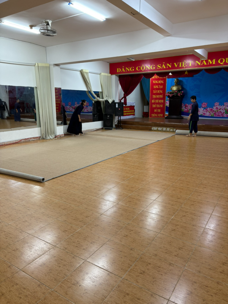 朝6時に二刀館道場に到着しました。そこは公民館と体育館をあわせたような5階建てぐらいの大きな建物でした。床が固いのでやわらかい絨毯を敷いての稽古です。平日の朝にもかかわらずたくさんの方が稽古に来られてました。侠(ヒッピ)先生を含めて二刀で稽古をされている方はおられませんでした。稽古終わりに侠先生にお礼をお伝えしたところ「朝ごはんを一緒にたべましょう」とお誘いいただきました。しかしハノイへの飛行機の時間が迫ってましたので辞退し,汗だくのまま空港へ移動しました。