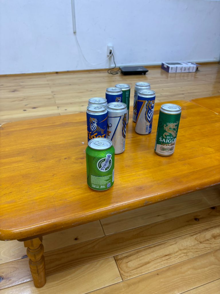 フォロワーの皆さんお元気ですか?剣道旅ベトナムの続きです。ホーチミンの心誠館では3回稽古をさせていただきました。1月27日の夜は二刀館という道場が出稽古に来られてました。心誠館の沈(シム)先生に,最後の稽古のお礼をお伝えしたころ「この後飲みましょう」と誘われました。道場の床にテーブルを置いての飲み会です。心誠館からは沈先生ご夫妻,金先生,Phamさん,二刀館からは侠(ヒッピ)先生ご夫妻が参加されました。