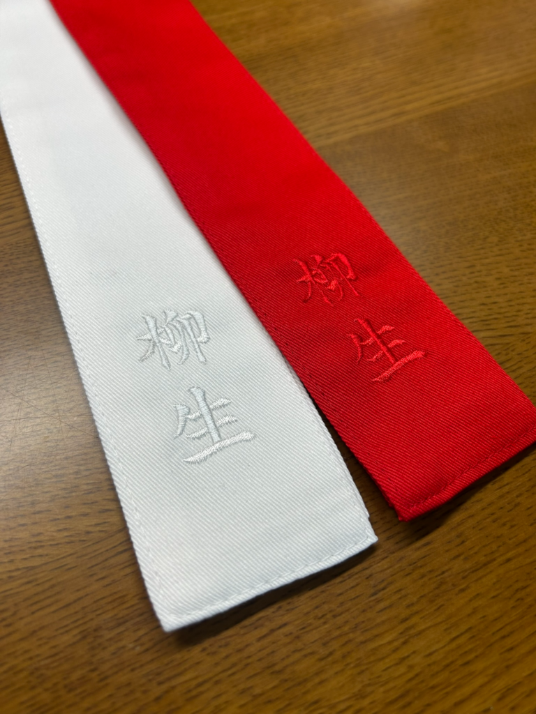 写真 上:前列の白い道着がフン先生。茶色部分がやわらかい木造、青い部分はコンクリートの固い床になってます。中:ここでも柳生の刺繍入りのたすきをお土産に持参しました。 下:建物の全体,この建物の最上階が道場になってます。